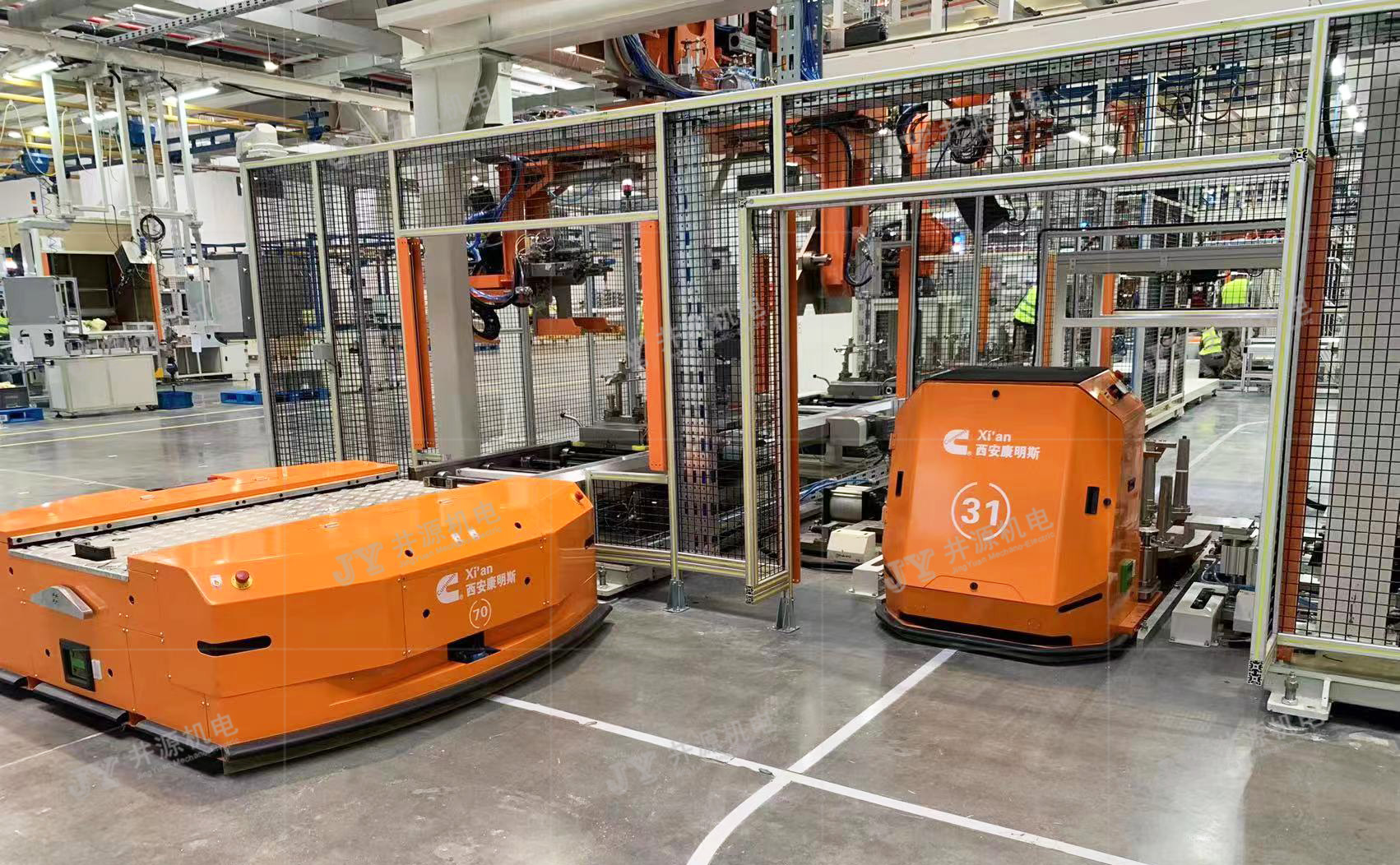 坐落于西安經(jīng)濟(jì)技術(shù)開發(fā)區(qū)的康明斯鳳凰項(xiàng)目,在發(fā)動機(jī)轉(zhuǎn)運(yùn)的設(shè)計上,就選用了井源多型號、多功能AGV的搭配方案。項(xiàng)目首創(chuàng)使用工藝AGV裝配線,完成發(fā)動機(jī)裝配線自動化轉(zhuǎn)運(yùn)工作,而全方位承載型輥道AGV則運(yùn)用于托盤轉(zhuǎn)運(yùn)工作,兩者結(jié)合,優(yōu)化工廠空間布局,AGV各工位間無設(shè)備連接,占用空間面積小,方便工人、物資的通行。根據(jù)客戶的需求,AGV采用定制化管理,滿足多種產(chǎn)品規(guī)格尺寸,1000KG-3000KG等負(fù)載要求,可視化界面的管理,實(shí)時匯報物料信息狀態(tài),監(jiān)控車間的物流運(yùn)輸信息,無論從生產(chǎn)的安全性角度,還是工作效率上,都更顯優(yōu)勢,整個產(chǎn)線也更為柔性化。