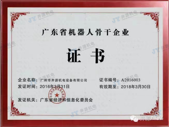 2016年3月22日,廣東省經信委公布了廣東省首批機器人骨干企業(yè)名單,廣州市井源機電設備有限公司榜上有名。近日,我公司正式收到了廣東省經信委頒發(fā)的“廣東省機器人骨干企業(yè)”證書。
