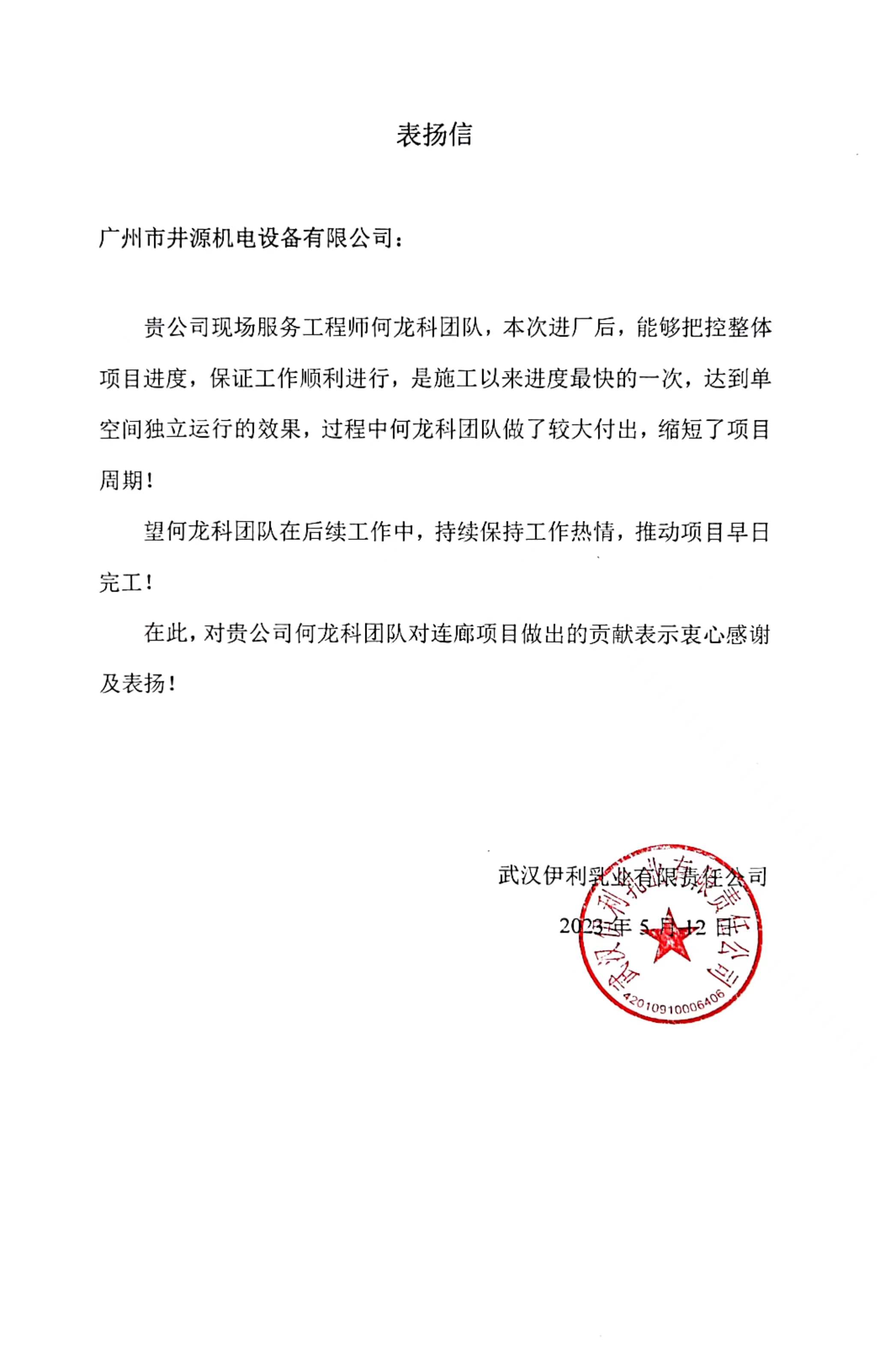 武漢伊利發(fā)來(lái)表?yè)P(yáng)信