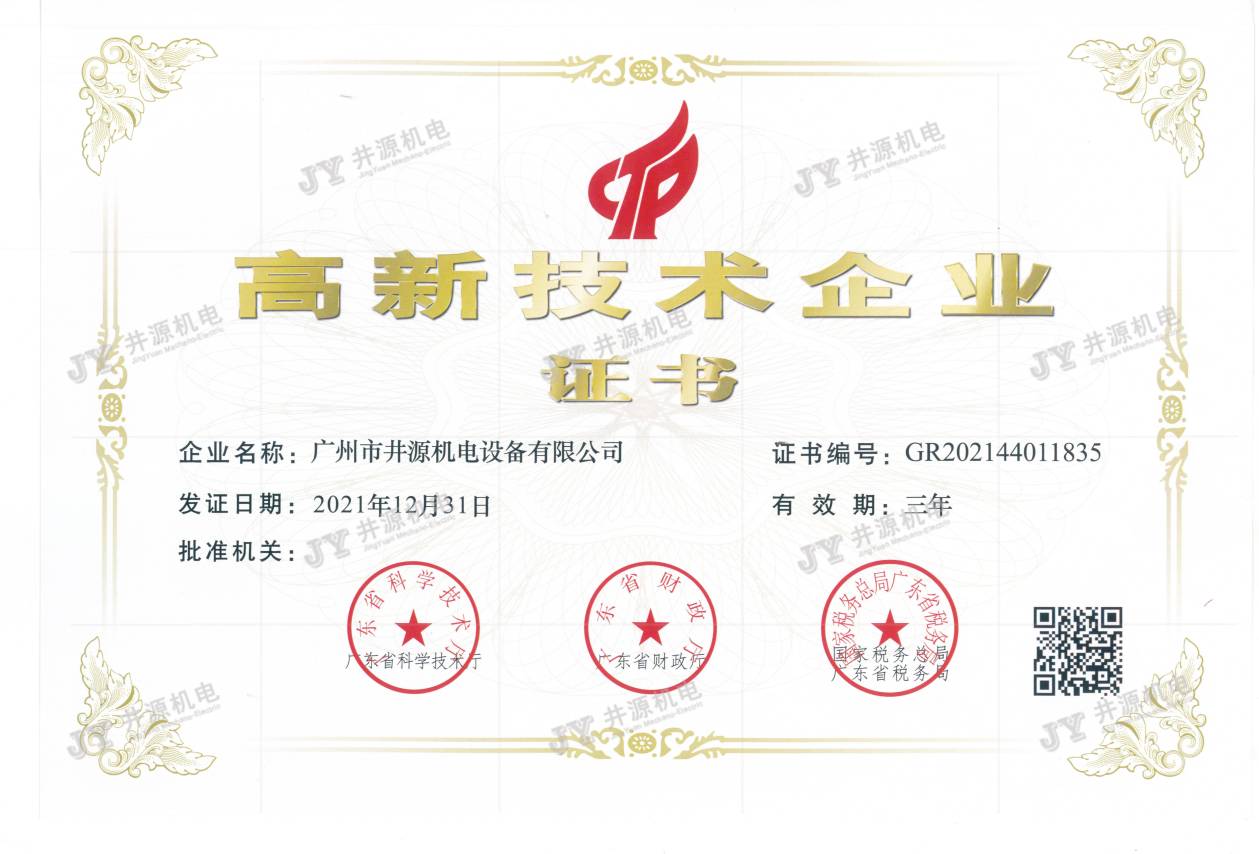 近日,廣州市井源機電設(shè)備有限公司收到由廣東省科學(xué)技術(shù)廳、廣東省財政廳、國家稅務(wù)總局廣東省稅務(wù)局頒發(fā)的高新技術(shù)企業(yè)證書。井源機電繼2012年以來,再次獲得高企認證復(fù)審?fù)ㄟ^,對得到政府單位及行業(yè)客戶對公司產(chǎn)品及技術(shù)的高度認可,倍感榮幸。