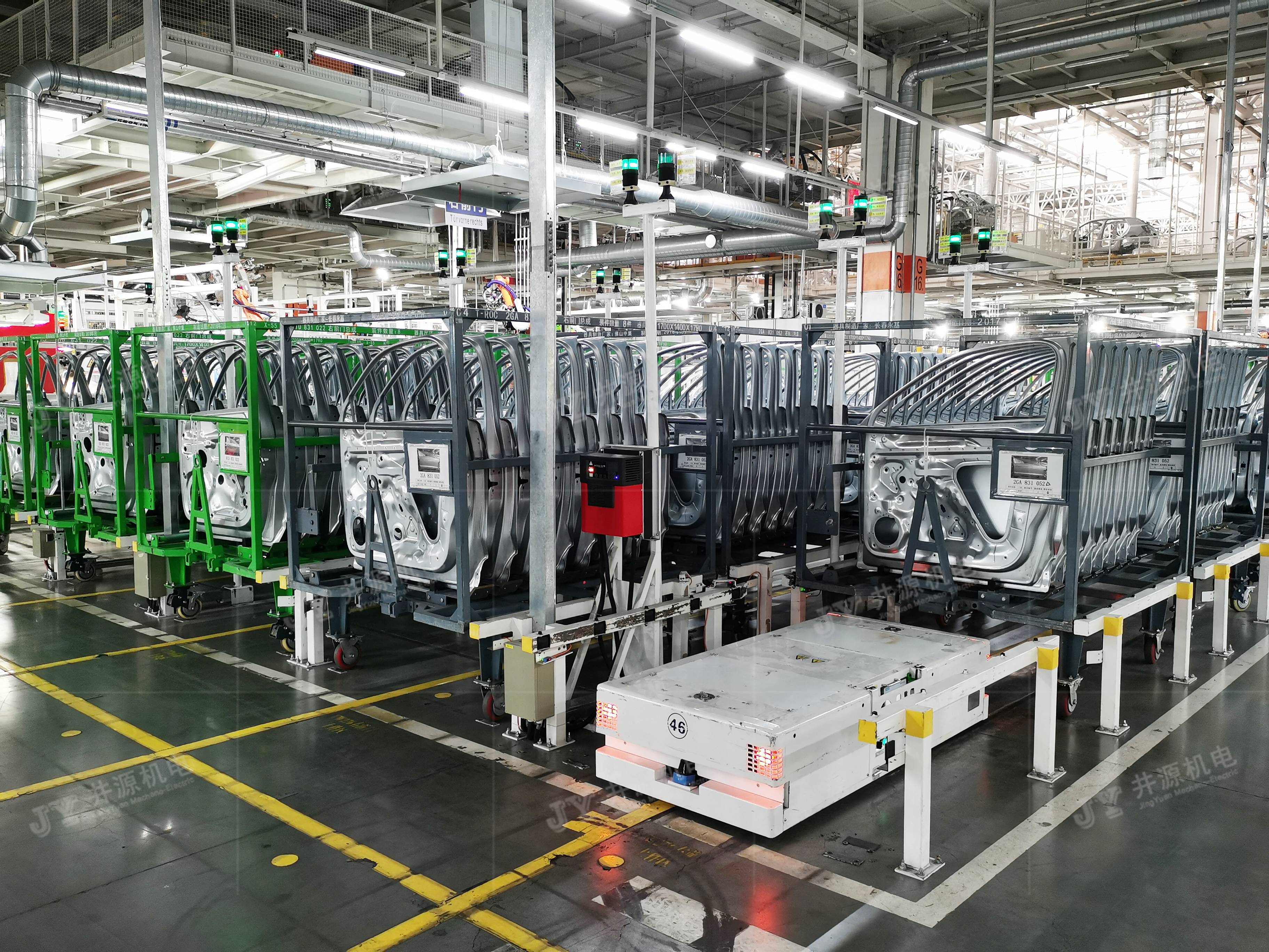 井源機(jī)電在此項(xiàng)目上采用了全方位雙舵輪牽引式AGV,實(shí)現(xiàn)了整廠(chǎng)物料自動(dòng)運(yùn)輸工作,通過(guò)AGV 運(yùn)輸系統(tǒng)與焊裝車(chē)間生產(chǎn)系統(tǒng)的車(chē)型順序進(jìn)行數(shù)據(jù)交換,實(shí)現(xiàn)網(wǎng)聯(lián),根據(jù)車(chē)型隊(duì)列,調(diào)整發(fā)車(chē)的上線(xiàn)節(jié)拍,智能匹配,實(shí)現(xiàn)實(shí)時(shí)供貨,滿(mǎn)足調(diào)整線(xiàn)三種車(chē)型60JPH的生產(chǎn)方案,最終實(shí)現(xiàn)第三種車(chē)型 VW380CN的四門(mén)、前后蓋及翼子板的物流配送,空器具返回等物流過(guò)程。
