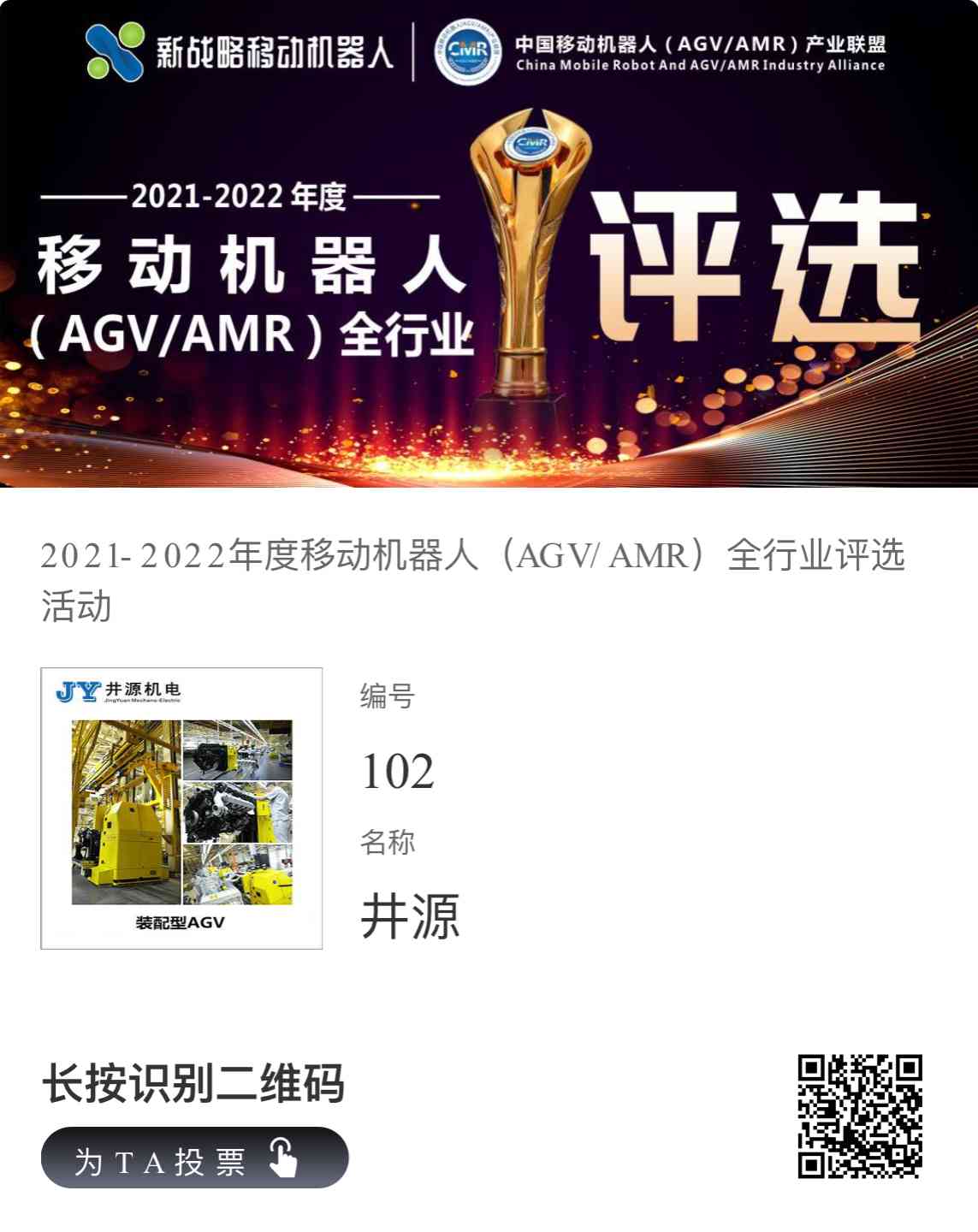 2021-2022年度移動(dòng)機(jī)器人(AGV/AMR)全行業(yè)評(píng)選活動(dòng)正如火如荼的開(kāi)展,井源機(jī)電深耕AGV行業(yè)18年有余,也積極加入榮譽(yù)爭(zhēng)奪戰(zhàn)場(chǎng)。請(qǐng)各行業(yè)同仁及用戶(hù)前來(lái)支持,您的認(rèn)可,將是我們持續(xù)努力奮斗的強(qiáng)心劑。